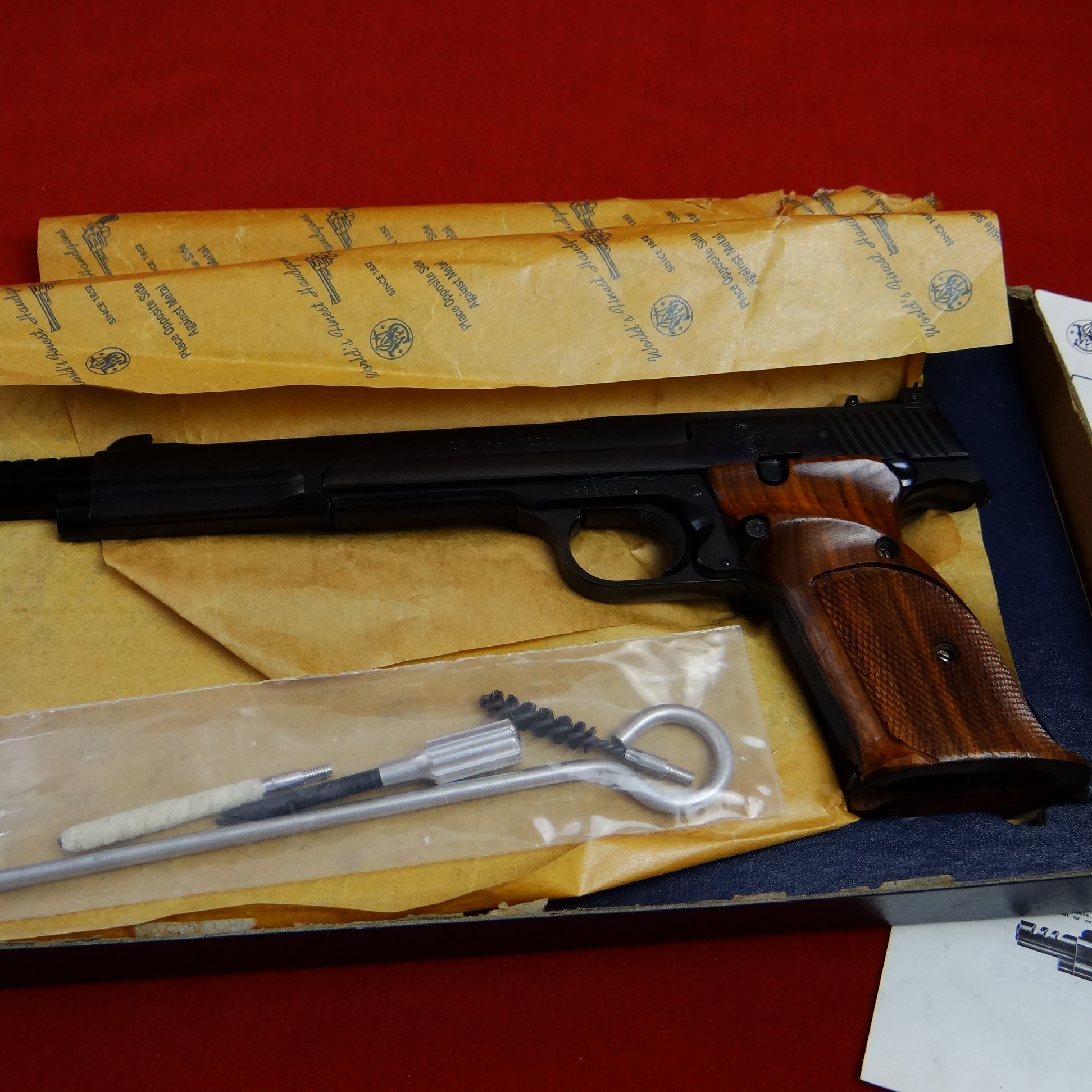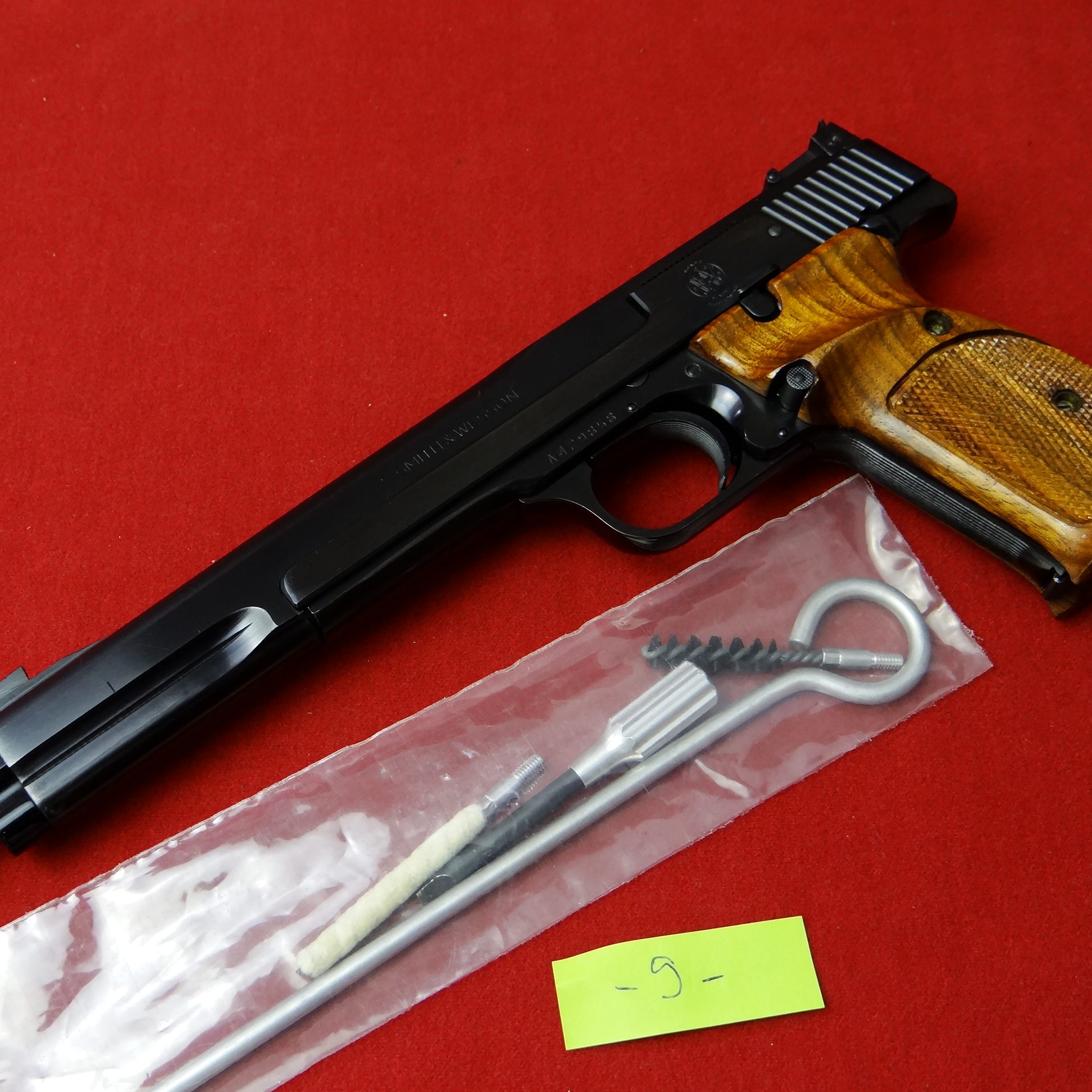Es handelt sich auch bei dieser schönen Pistole um eine Smith & Wesson Mod. 41 in der Ausführung mit 7,5 Zoll Lauf und Kompensator.Diese Ausführung ist sehr selten. Die Pistole befindet sich in tadellosem Zustand und wurde nie geschossen; sie stammt aus einer Sammlung.Ein absolute seltenes Stück. Von der hervorragenden Präzision brauche ich bei dieser Waffe nicht sprechen, den Kennern ist Sie ein Begriff.Die Pistole ist mit den original Smith & Wesson Holzgriff Schalen ausgestattet.Die Waffe ist in der original Verpackung mit Bedienungsanleitungen und Zubehör.Für weitere Informationen nehmen Sie bitte Kontakt mit uns auf.